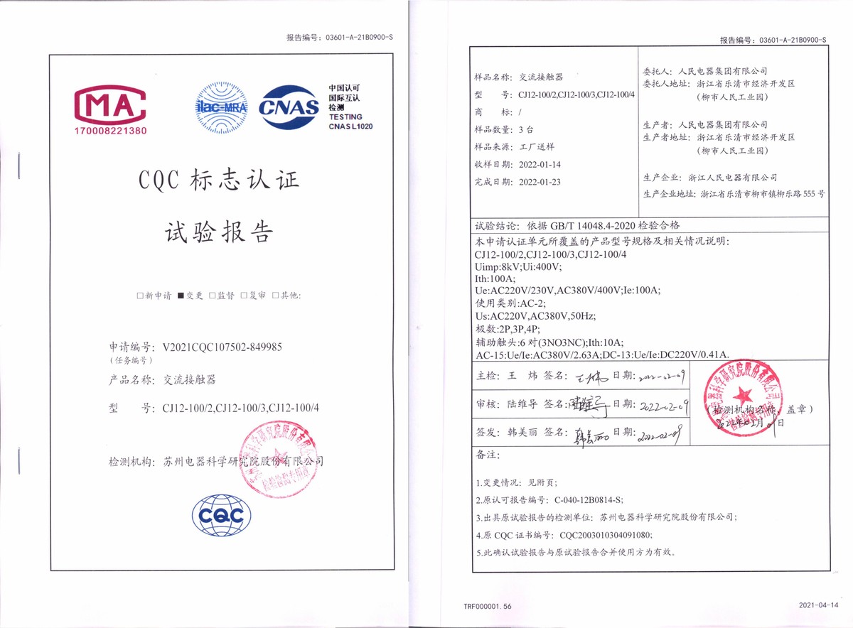 CQC试验报告(202202):CJ12-100/2,CJ12-100/3,CJ12-100/4交流接触器